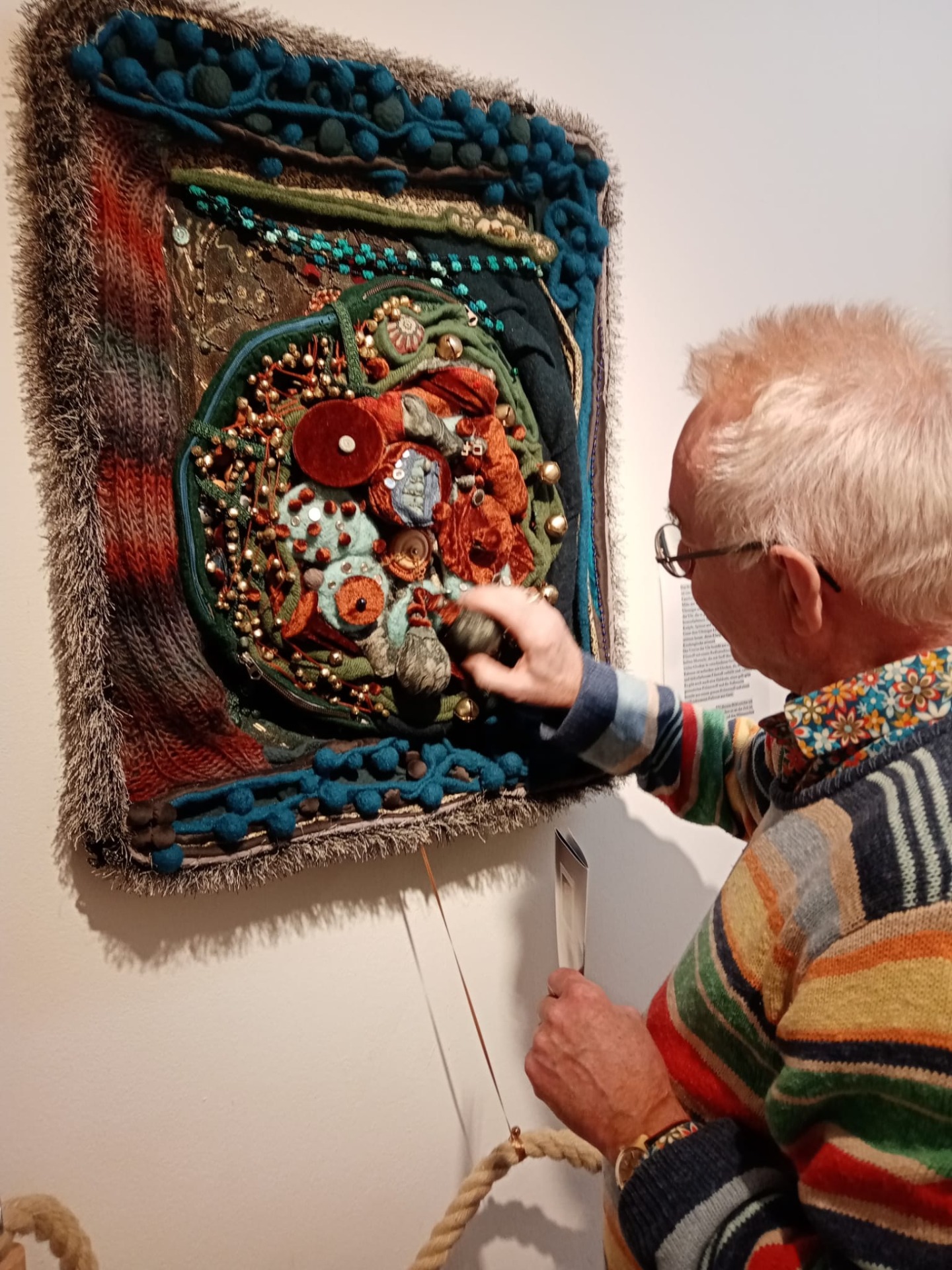 Seine Hand berührt das Kunstwerk, das aus verschiedenen Materialien wie Garn, Perlen und Stoffen gefertigt ist und grüne, gelbe und blaue Farben zeigt.