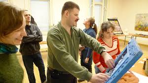 Die Ausstellung war in Szeged in Ungarn.Ein Mann mit einem Schnurrbart in einem grünen Hemd steht im Vordergrund. Er hält einen blauen, rechteckigen Gegenstand in der Hand und scheint ihn einer Gruppe von Menschen zu zeigen, die um ihn herumstehen. Die Gruppe besteht aus mehreren Personen, darunter zwei Frauen im Vordergrund: eine mit einem grünen Pullover, die ihn anlächelt, und eine andere, die einen rot-weiß gestreiften Pullover trägt. Im Hintergrund sind weitere Personen zu sehen.