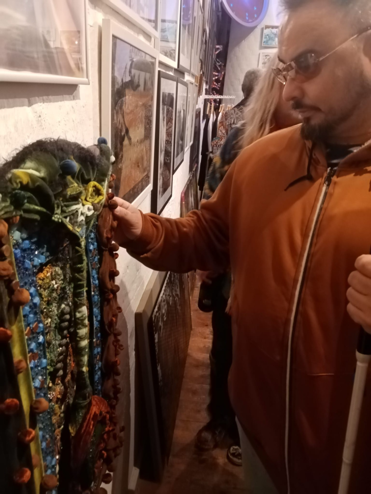 Das Foto zeigt eine Nahaufnahme eines blinden Mannes, der in einer Kunstgalerie ein taktiles Kunstwerk an der Wand berührt.