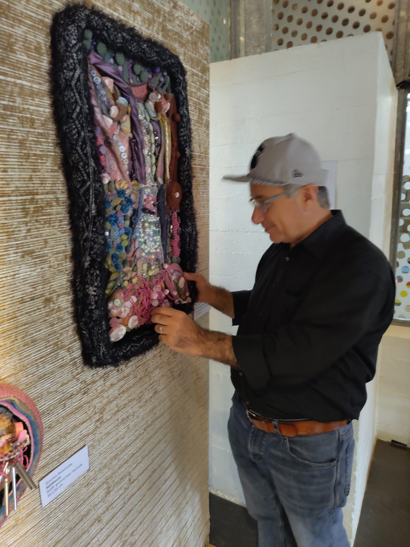 Das Foto zeigt einen Mann, der sich bei einer Ausstellung in Zürich einem taktilen Kunstwerk widmet. Er trägt eine schwarze Hemd und eine Jeans sowie eine graue Basecap, die er verkehrt herum auf dem Kopf hat. Mit seiner rechten Hand berührt er vorsichtig ein an der Wand hängendes, gerahmtes Kunstwerk. Dieses Werk hat einen breiten, schwarzen, pelzähnlichen Rand und eine bunte, vielschichtige Oberfläche, die aus verschiedenen Stoffen, Garnen, Pailletten und anderen Materialien zu bestehen scheint. Das Kunstwerk trägt den Titel "Wo ist der Kuckuck?" und wurde beim Ararat Kunstfestival am 28. September 2025 im GZ Heuried in Zürich ausgestellt. Der Hintergrund ist eine mit Textur versehene Wand, und in der Ecke ist ein Teil eines Fensters mit runden, farbigen Verzierungen zu sehen.