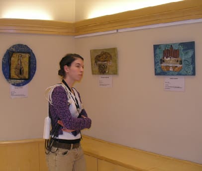 Her arms are crossed, and she is looking away from the artworks, in another direction.