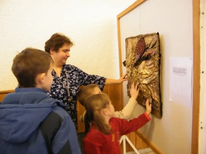 The image shows a woman and three children standing in front of a piece of art hanging on a wall. The woman has brown hair and is wearing a dark blue patterned top. She stands in the center, smiling, as she guides one of the children's hands toward the artwork. The three children are seen from behind. One is wearing a blue jacket, and another is wearing a red sweater. They are all reaching out to touch the tactile, gold, and brown artwork, which is mounted on a white panel inside a wooden frame. The setting appears to be an exhibition space or a library.