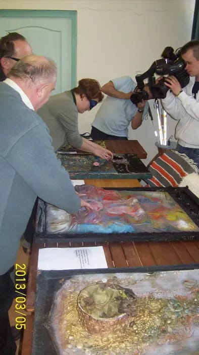 Exhibition in Miskolc in Hungary. The photo shows a group of people gathered in an exhibition space. In the foreground, several tactile artworks are visible on tables, which the attendees are touching. Two men are seen from the side; one is wearing a light blue sweater and is reaching out to touch one of the artworks, while the other is in the foreground with his back to the camera. In the background, a woman in a dark top and a film crew, consisting of a cameraman and a man with a microphone, can be seen recording the scene. The attendees are actively interacting with the exhibits by exploring them with their hands. The date "2013/03/05" is visible in the bottom left corner of the image.