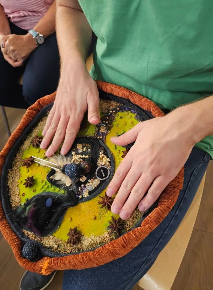 Snapshots from today's conference. The photo shows a close-up of a person's hands touching a tactile artwork. The person is wearing a green T-shirt and jeans. Their hands are resting on a round, flat art object that has a yellow surface in the center and a frame wrapped in orange yarn at the edge. The artwork is decorated with various materials, including beads, star anise, feathers, and a central black button. A person in the background is wearing a pink top and a wristwatch, seemingly also waiting.