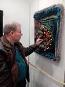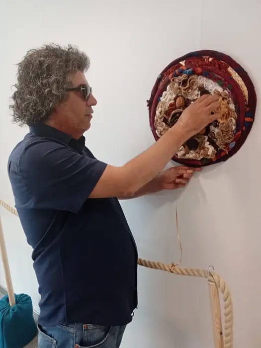 The photo shows a man with curly, gray-flecked hair and sunglasses. He is wearing a dark blue short-sleeved shirt and jeans, and is standing next to a round piece of wall art that he is touching with both hands. The artwork is made of various yarns, wool, and other materials in shades of red, brown, and beige. A rope barrier runs in front of him, marking a distance from the artwork. A broom or similar object is visible in the background. The photo was taken at the Cuba Now Gallery in Zürich.