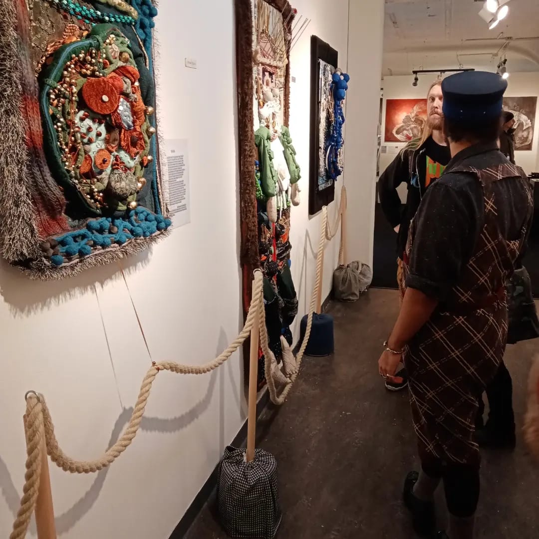 Along a white wall, several artworks are displayed, made from different materials and textures.