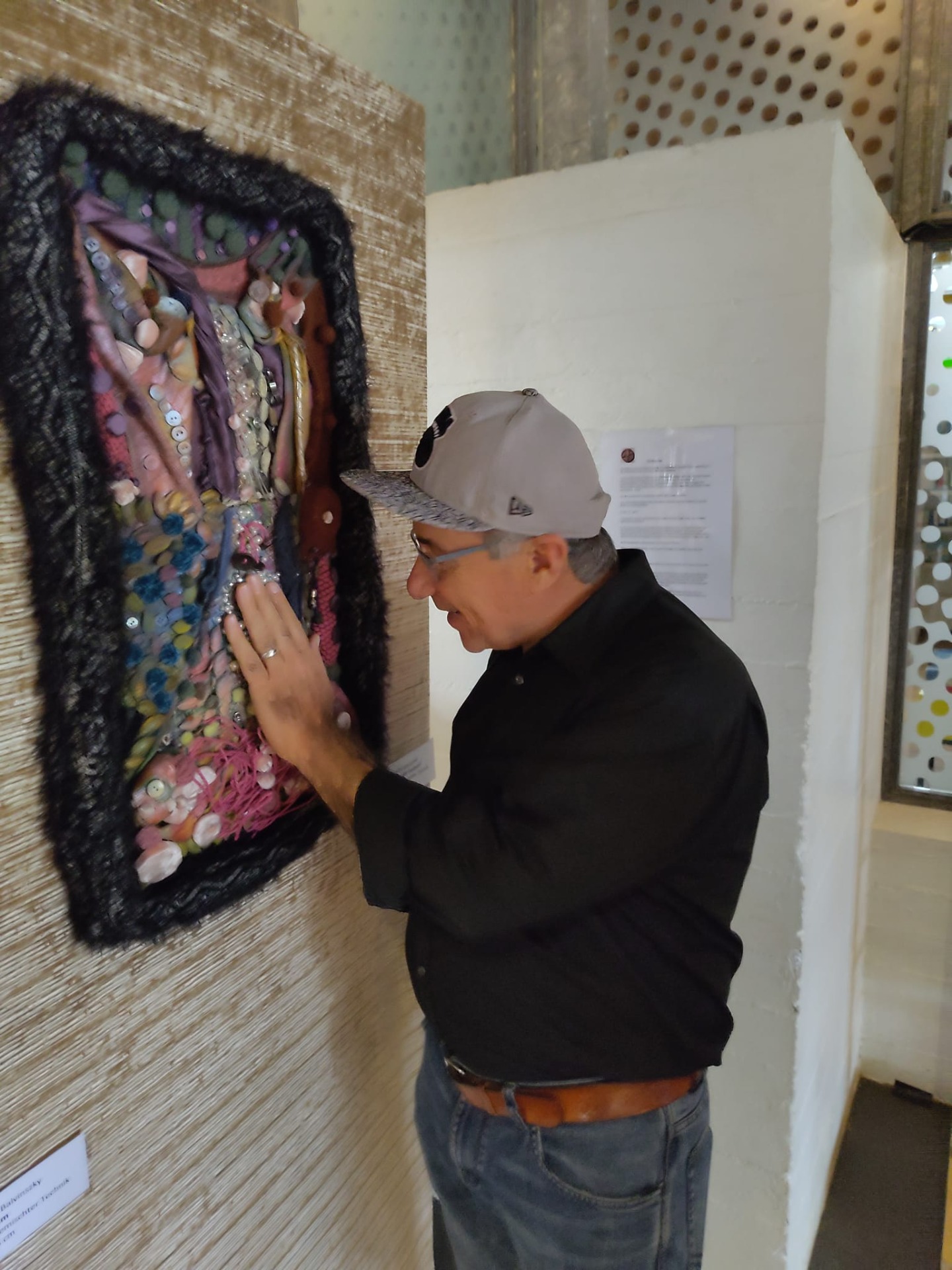 Das Foto zeigt eine Nahaufnahme eines blinden Mannes, der in einer Kunstgalerie ein taktiles Kunstwerk an einer Wand berührt. Er trägt eine braune Jacke oder einen braunen Pullover und eine Brille. Seine Hand ist auf dem Kunstwerk platziert, das aus verschiedenen Materialien wie Garnen, Perlen und Stoffen gefertigt ist und eine grüne, gelbe und blaue Farbpalette aufweist. Das Kunstwerk heisst: "Asanas". Der Hintergrund ist mit weiteren gerahmten Kunstwerken und Fotografien gefüllt, die eng nebeneinander an den Wänden hängen. Die Szene spielt sich in der Galeria 16b in Zürich ab, die bekannt dafür ist, Werke von mehreren Künstlern in Gruppenausstellungen wie der "Kunstrausch" zu zeigen.