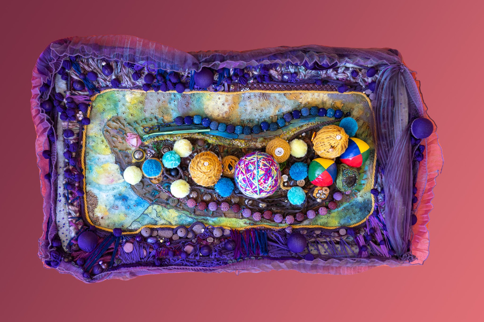 Sein Rahmen wurde aus grau-lila- und bordeauxfarbigen Seidenstoffen angefertigt. Der Rahmen ist mit lilafarbigen Perlen, Fäden, Wollen, Steinen, ein lila Lederarmband und noch einer Herzmedaillie geschmückt. Der Rahmen von dem Bild ist mit einer gelbfarbigen Schnur abgegrenzt worden. Auf dem Bild finden wir einen großen Fussabdruck. In Hintergrund sind mehrere Farbtöne von gelb, helblau, grün und hellbraun. Der Fußabdruck besteht aus Glassteinen, Knöpfen, Ohrstöpselstücken, Schnüren, Perlen, Nelken, Zimtpulver und unterschiedlichen Bällchen. Die Bällchen sind die folgenden: ein grösserer Ball mit bunten Fäden gefüllt, Massagebällchen, Bällchen mit Fell, Bällchen aus Leder, Bällchen mit gelbfarbigen umhüllten Schnüren und noch einer Glaskugel, die mit Perlen verziert ist und eine pyramidenförmige Pyramide. Die äußere Seite des Fußabdruckes wurde mit Perlenhalsketten und einem Pedikürsett gebildet.